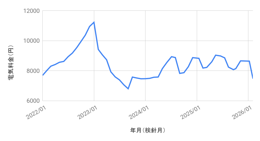 2026年2月検針(1月使用分)は、「電気・ガス料金支援」の補助金が再開されたことで、全エリアで値下げとなりました。一例として、東京電力EPの電気料金プラン「スタンダードS」の電気代の推移を見ていきましょう。