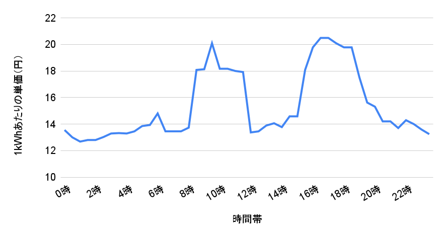 例えば、16時30分〜17時29分は電力量料金単価が20円前後と高くなっている一方、日中の12〜13時は13円代と比較的安いことが分かります。また、1~2時の深夜帯の単価も安くなっています。